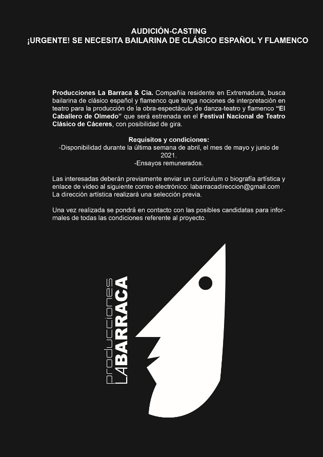 Audición-casting para cubrir el puesto de  una bailarina de danza española y flamenco y  un cantaor para la producción de la obra-espectáculo de danza-teatro y flamenco "El Caballero de Olmedo" que será estrenada en el Festival Nacional de Teatro Clásico de Cáceres 2021.
