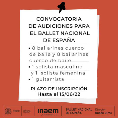 El Instituto Nacional de las Artes Escénicas de la Música (INAEM) ha abierto procesos selectivos para la cobertura de puestos de personal laboral temporal, como bailarines y guitarrista, en el Ballet Nacional de España.