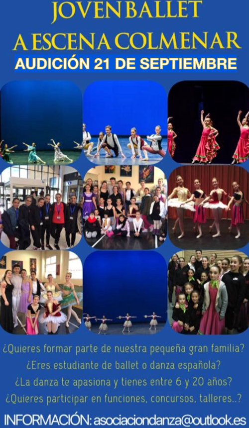 Abierto el plazo de inscripción para la audición del Joven Ballet de "A Escena Colmenar". Está dirigido a alumnos de Ballet y Danza Española a partir de los seis años de edad (primero de primaria).
