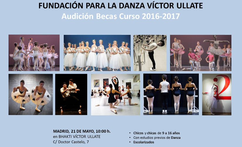 La Fundación para la Danza Víctor Ullate, en colaboración con Víctor Ullate Ballet Comunidad de Madrid, realizará audiciones a menores interesados en optar a una beca de cara al próximo curso 2016-2017 (la beca financia la matrícula y mensualidades de estudios de danza, parcial o totalmente, en función de unos requisitos estipulados de nivel y aptitudes de danza, así como económicos).