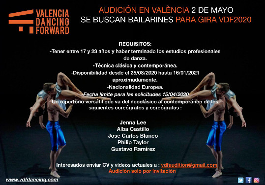 València Dancing Forward busca bailarines para la gira del espectáculo VDF2020 formado de piezas que van desde el estilo neoclàsico al contemporáneo de los siguientes coreógrafos: